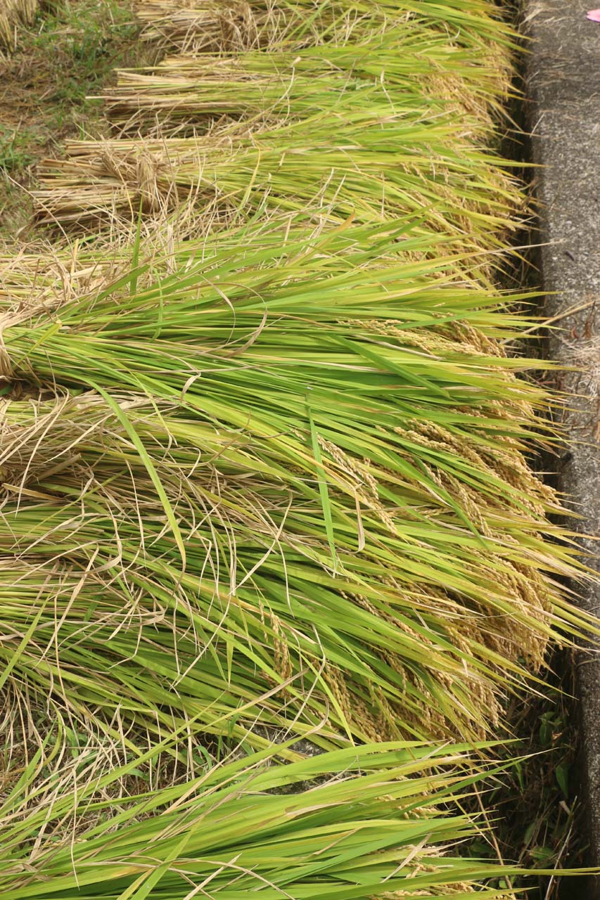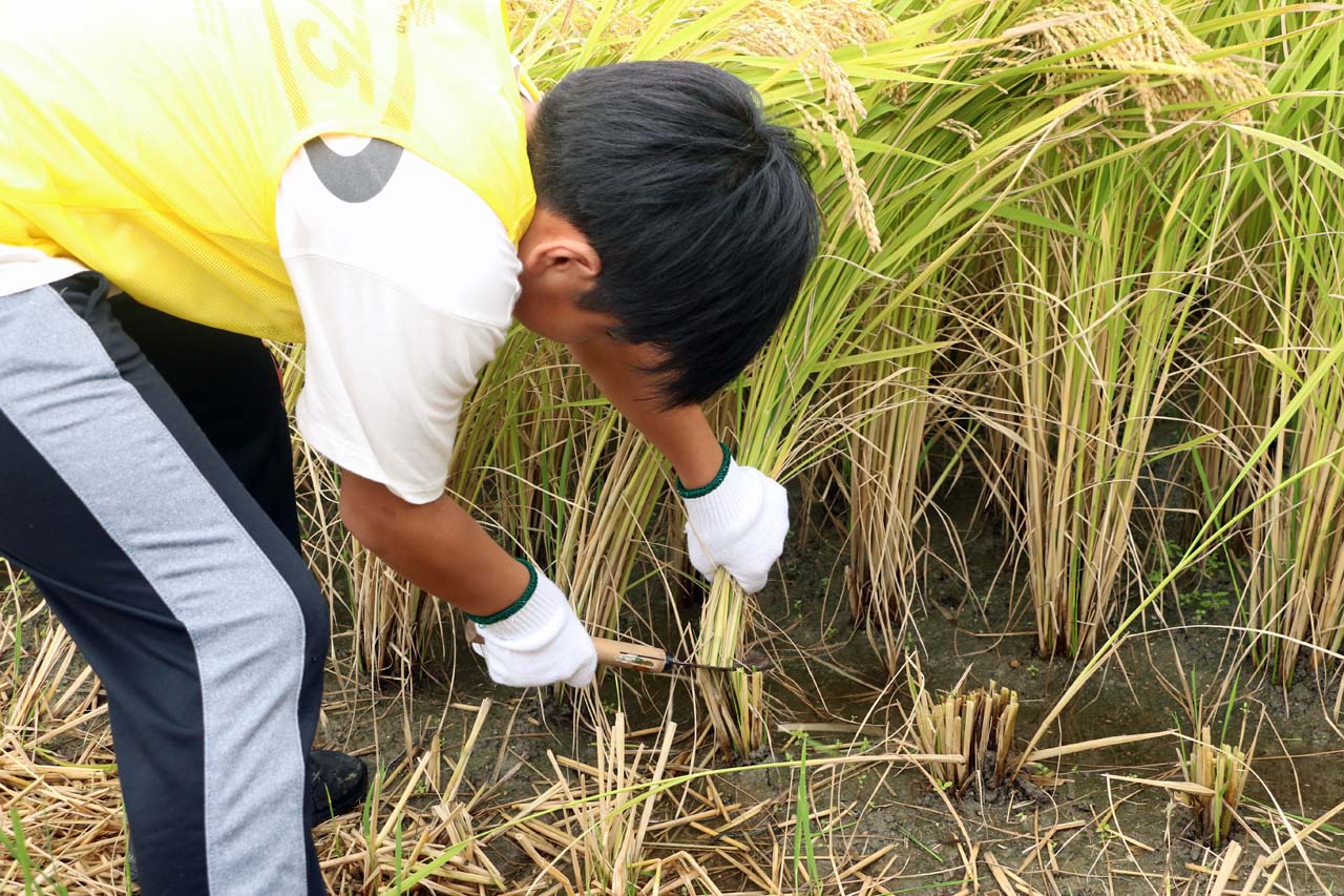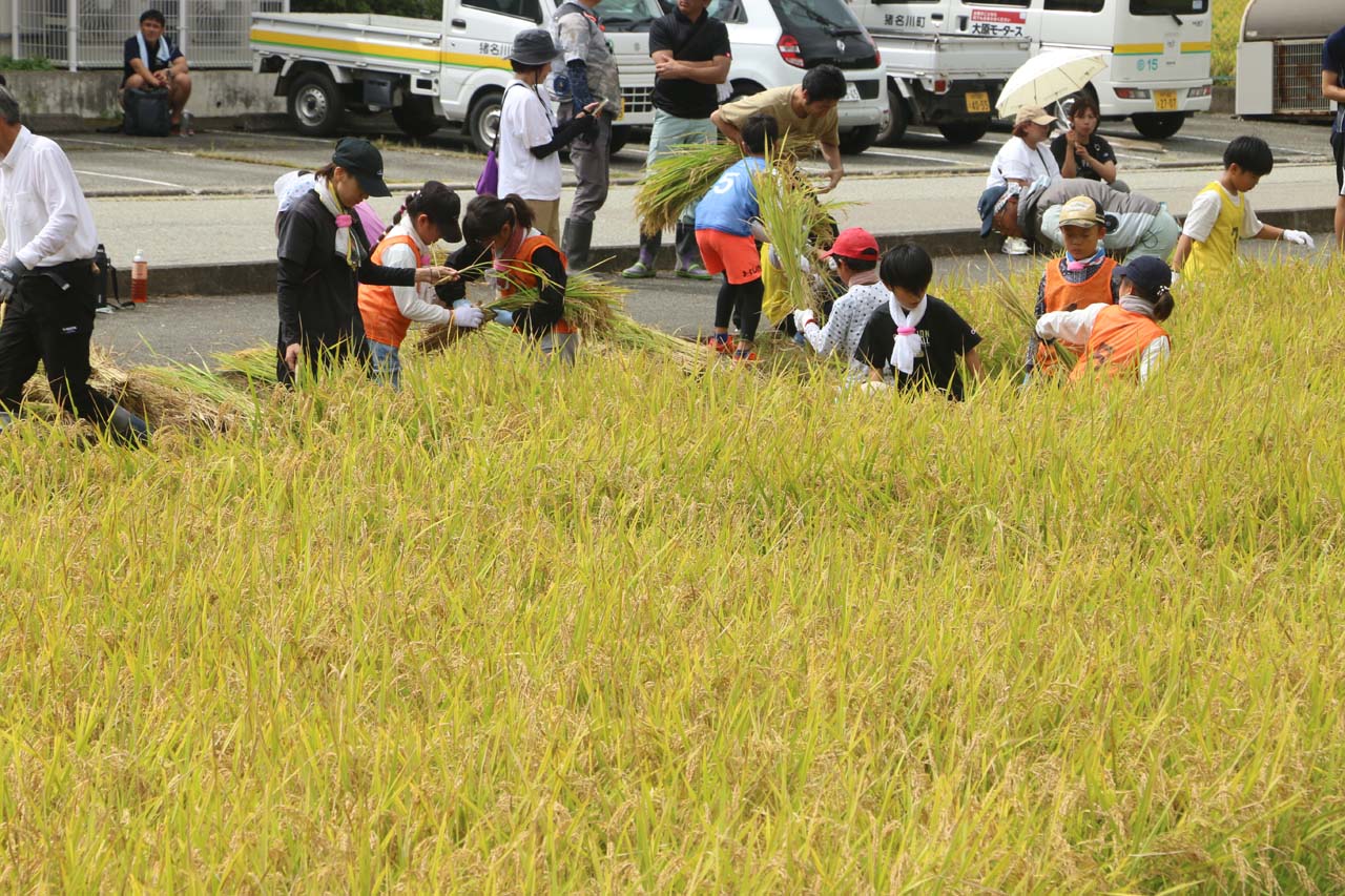 黄金色に実って重たくなった穂頭に目を輝かせて、穂の根元を刈り取っていました。