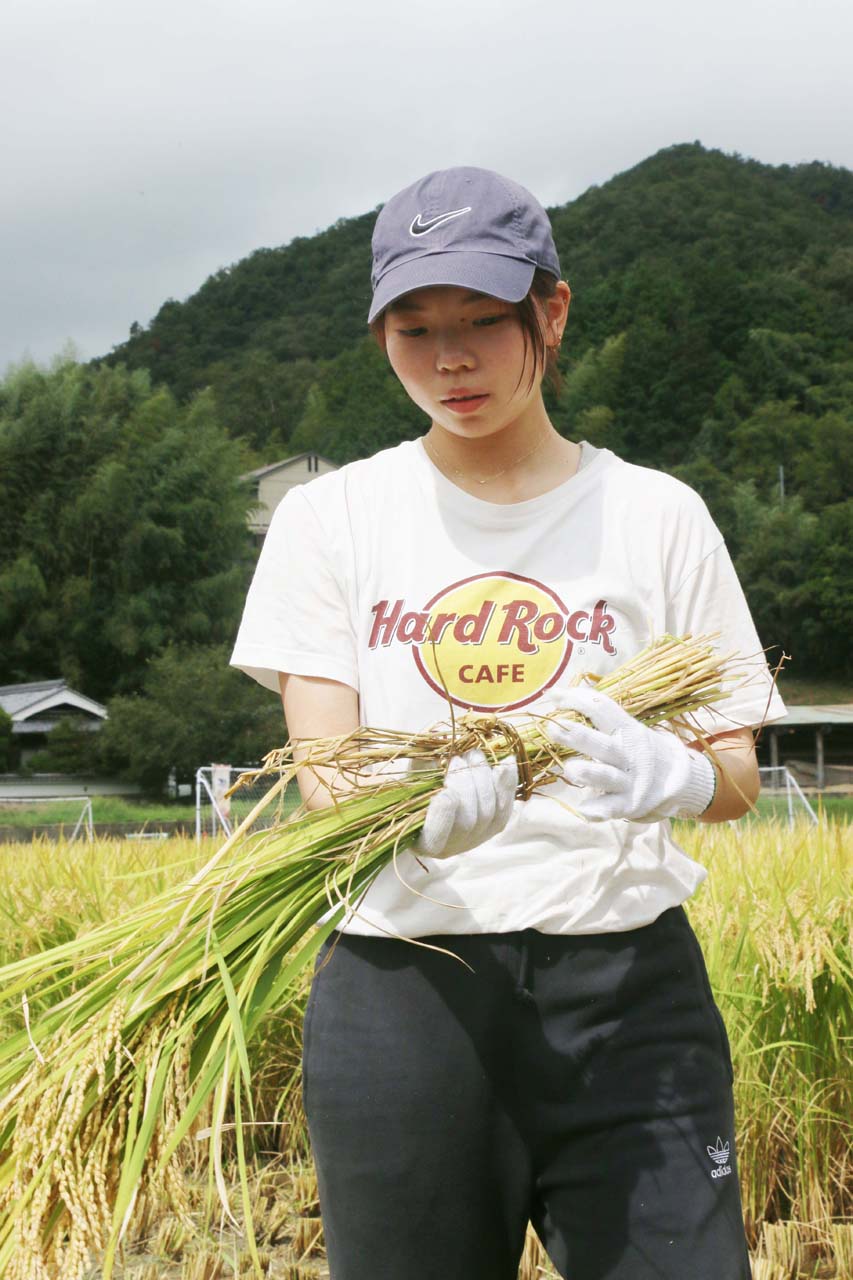 地元の方たちに教えてもらいながら、昨年の藁を使って穂をまとめる作業も体験していました。