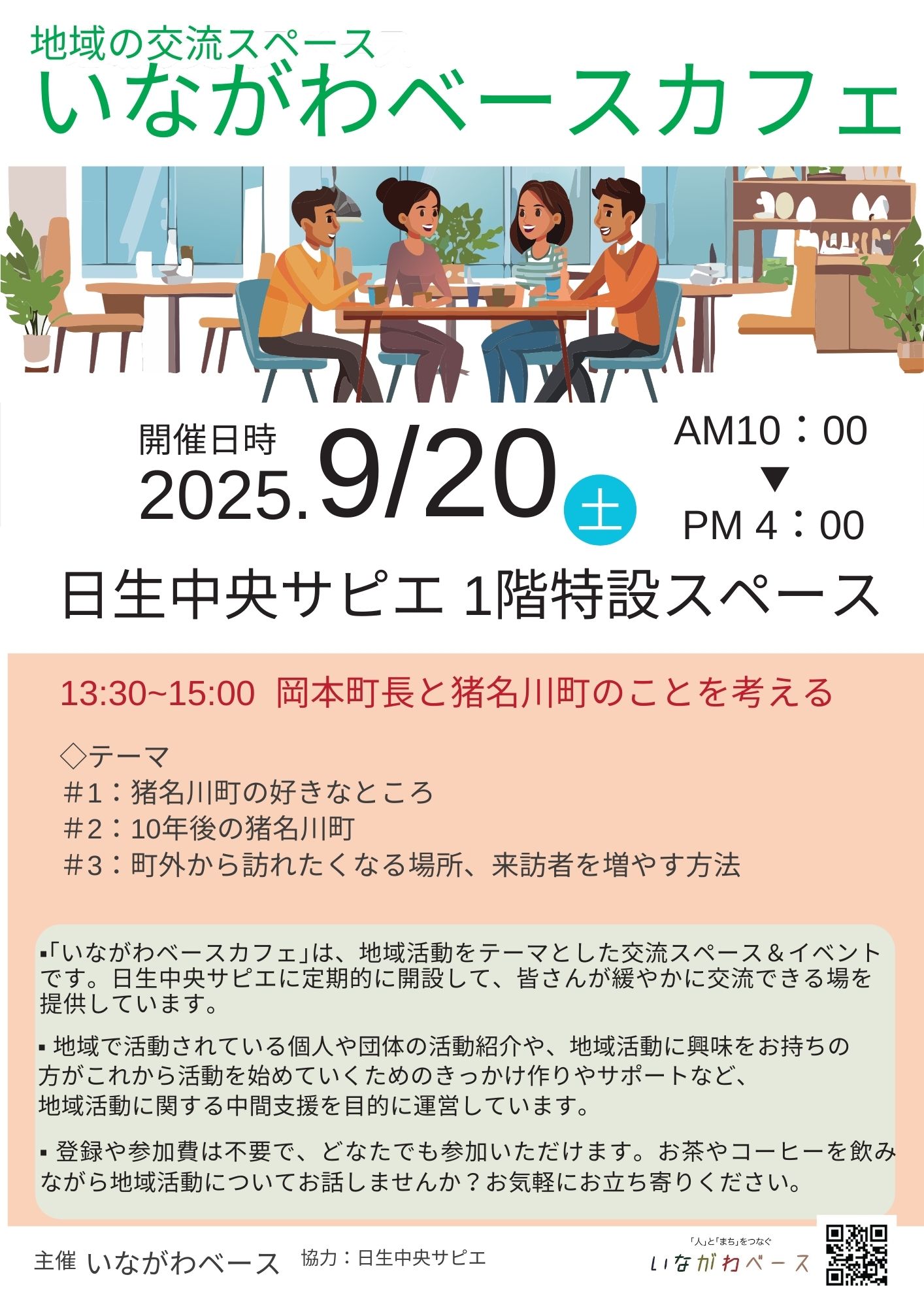 9/20(土)、日生中央サピエに特設の交流スペース「いながわベースカフェ」を開設します。お茶やコーヒーを飲みながら、地域活動についてお話ししませんか。また、今回は猪名川町の岡本信司町長をお迎えし、3つのテーマに沿って参加者と一緒に猪名川町のことを考えていきます。