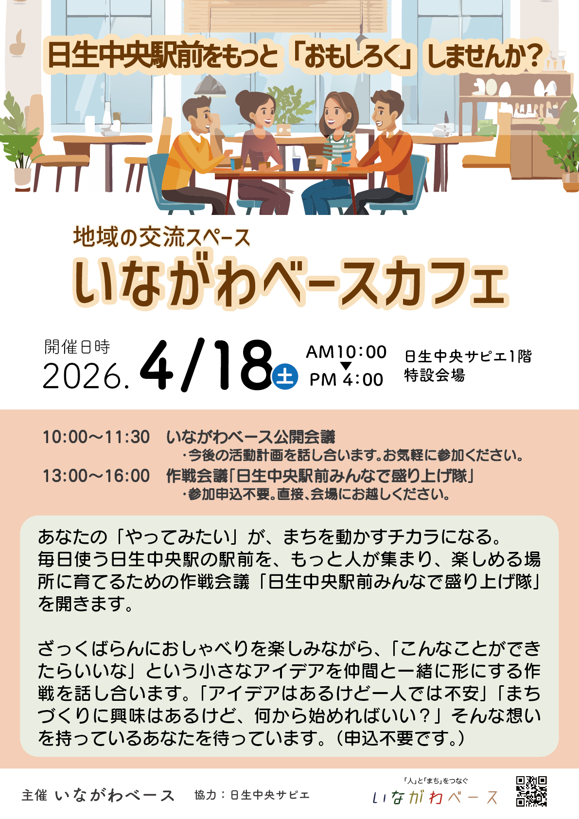 4/18(土)、日生中央サピエに特設の交流スペース「いながわベースカフェ」を開設します。お茶やコーヒーを飲みながら、地域活動についてお話ししませんか。