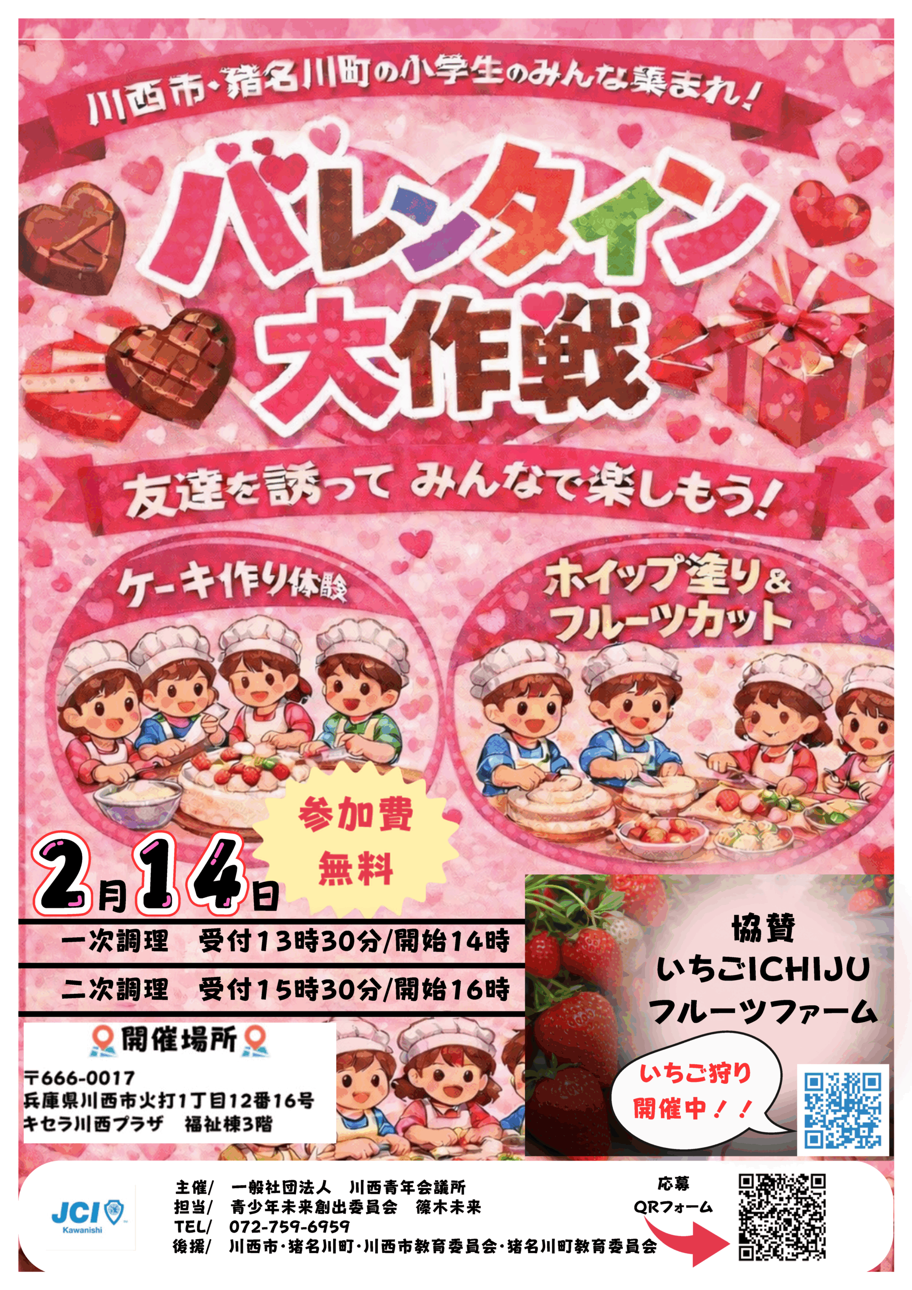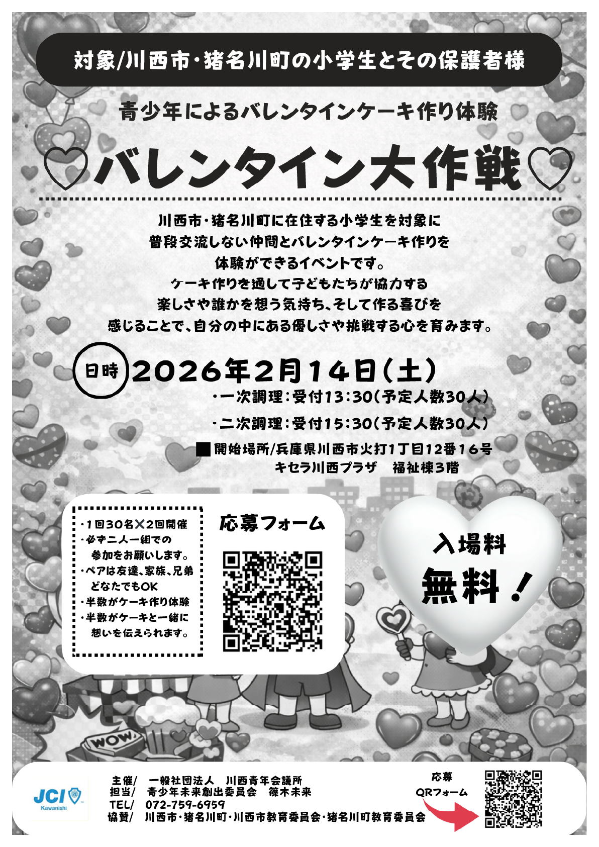 川西青年会議所主催によるイベント「バレンタイン大作戦」が、2026/2/14(土)に川西公民館で開催されます。川西青年会議所からの案内をご覧ください。